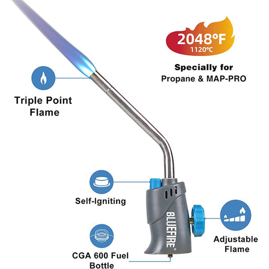 BLUEFIRE Handy Cyclone Torch Head Portable Brass Gas Torch Trigger Start Self-Ignition Nozzle Torch Fuel by MAPP MAP PRO Propane Gas Cylinder for Soldering Welding Plumbing Repair Lighting Glass DIY