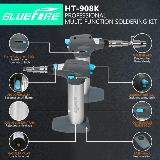 BLUEFIRE HT-908K Butane Soldering Iron Kit Portable Butane Torches Multi-Function Mini Torch for Wood Burning,Hot-Knife,Soldering|Self-Igniting,Adjustable Flame,Light Weight,Rapid Heat Up,Cordless